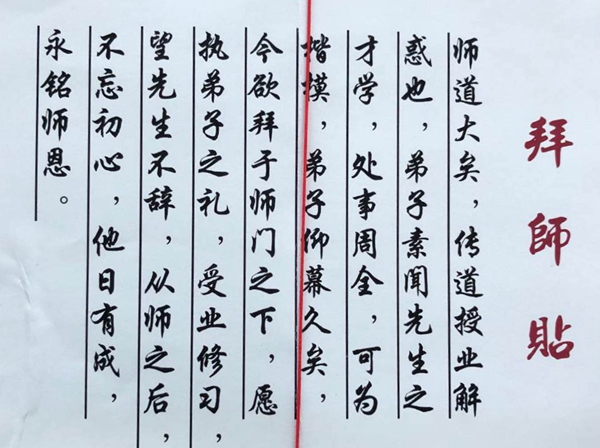 “……处事周全,可为楷模,弟子仰慕久矣,今欲拜于师门之下,愿执弟子之礼,受业修习,望先生不辞,从师之后,不忘初心,他日有成,永铭师恩。”