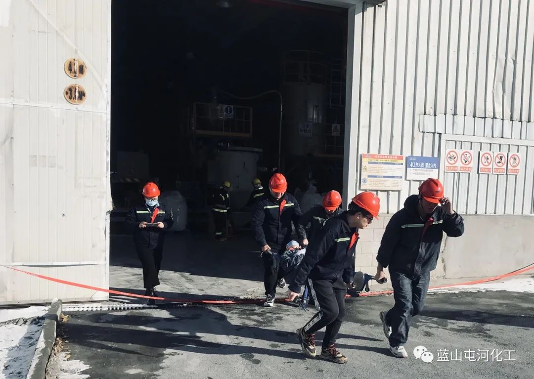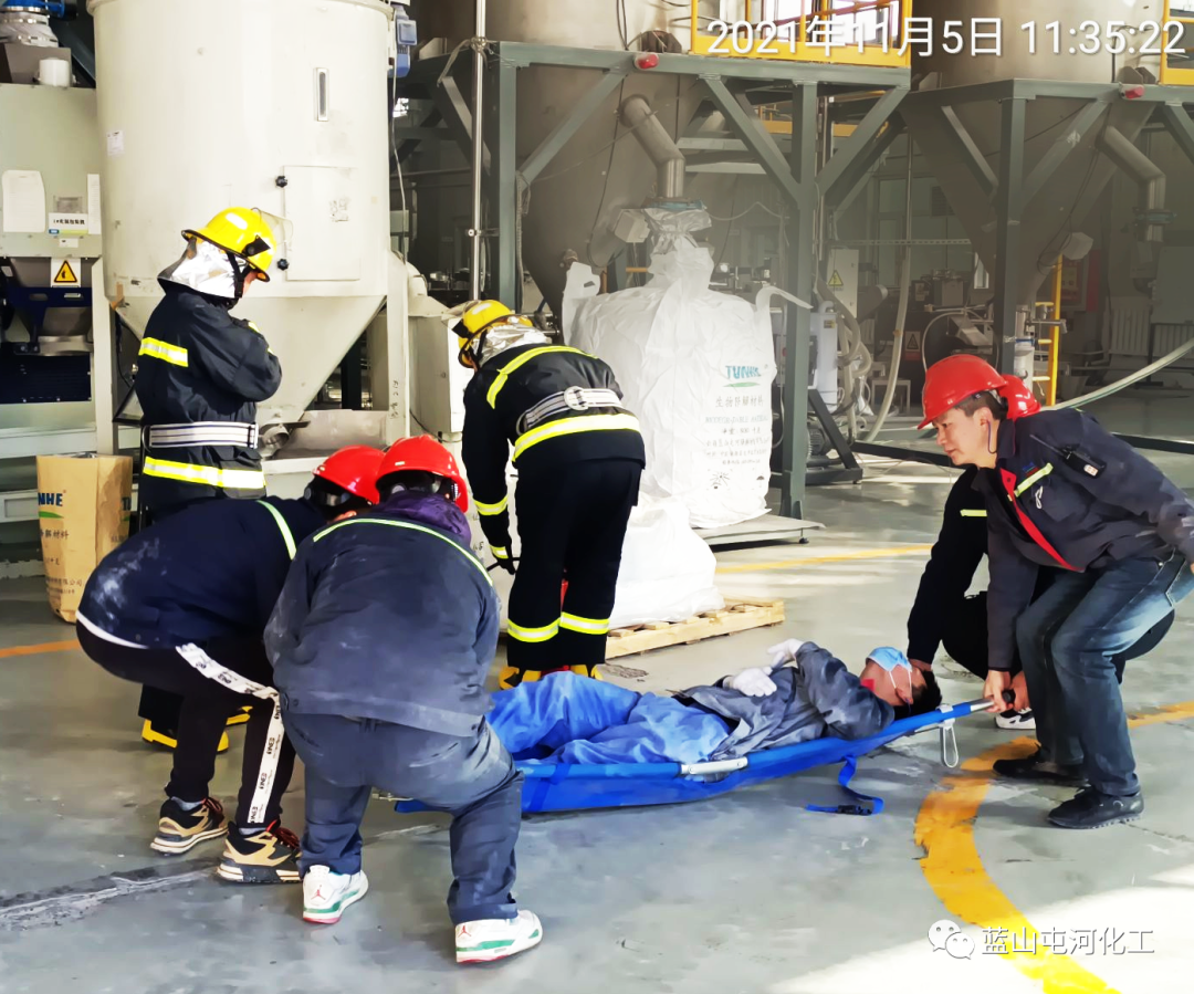 应急救援组穿戴好防护用品,检查灭火器完整情况后,对现场火灾警戒观察灭火,利用混料车间消防栓对起火区域喷淋,并对有可能受火灾事件影响扩大的区域持续喷淋覆盖及降温;警戒医疗组设置警戒线,进行通行管制,组织人员疏散到指定区域,对受伤人员实施急救;后勤保障组联系车辆送受伤人员前往医院;各属地负责人清点班组人员,确认伤害状态......随着演练的进行,一条条应急预案紧张有序的落实到位,现场指挥得当,大家协同配合,圆满完成各项演练流程,达到预期效果。