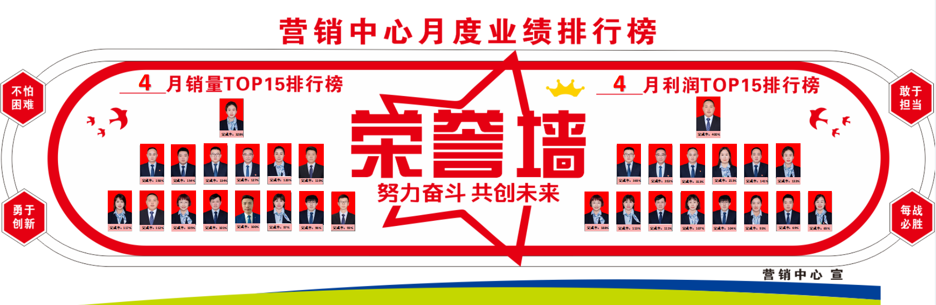 为塑造积极向上的销售竞争文化,让营销中心全体干部职工珍惜荣誉,牢记使命,营销中心近期专门打造了具有营销特色的荣誉墙。通过荣誉墙对中心销量完成率、利润完成率排名前十五名的员工进行公示表彰,对当月团队业绩排名前三、季度排名靠前的团队进行展示鼓励。