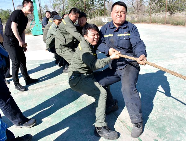 每个参赛队队员都使出浑身解数,双手紧紧攥着绳子,身体往后弓,中心下沉,眼里流露出必胜的决心。队员们个个使出吃奶的力气,双手像大钳子一样死死地拉着绳子,眉毛好像都要竖起来了,双眼紧闭,咬牙切齿,不时“吼”几声,为自己加油;脸涨得通红,如猛虎一般,比得不分上下。啦啦队员看得更是着急,激动地挥舞着双手,跳着喊着:“加油啊!加油!”呐喊声、加油声在操场上回荡着。“两军相逢勇者胜”,关键时刻比的不仅是体力,更是意志,队员们,坚持住。最终热力车间代表队欢庆得了冠军,他们欢呼雀跃,欣喜若狂。