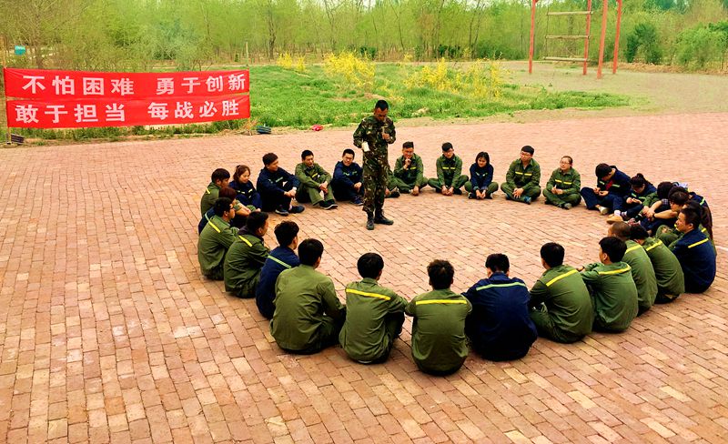 当天,经过一小时的车程,终于到达目的地——华兴拓展培训中心。在教练的指挥下,全员下车集合,整顿队形,“稍息,立正,站好!”停止间转法“向右转、向左转和向后转”,军人的飒爽英姿,严格作风,铁一般的纪律!热身结束后,为激发队员们的积极性,分为两队,通过各组队员共同设计自己的队名、口号、队形、队歌来建立团队荣誉感,展开激烈竞争。