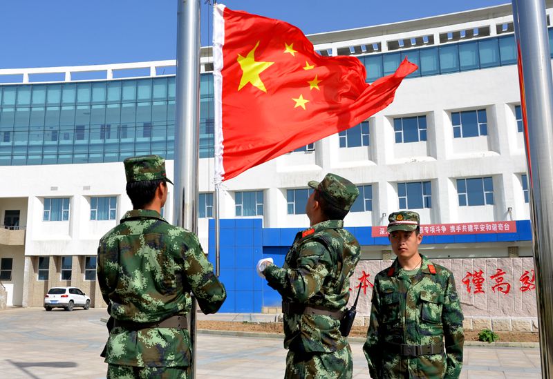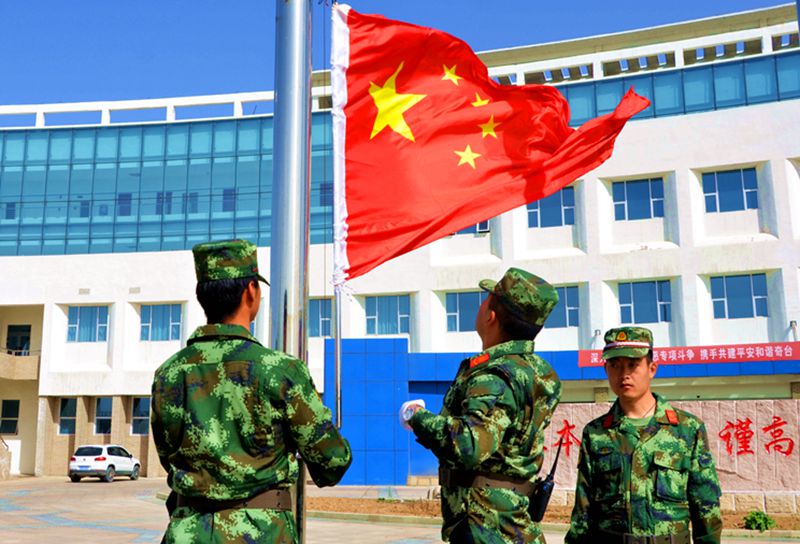 在《歌唱祖国》的乐曲声中,消防队5名战士步伐坚定,气势轩昂的护卫着五星红旗走向升旗台。伴着庄严的《义勇军进行曲》,所有人员行注目礼,五星红旗冉冉升起,在朝阳的映照下,五星红旗分外鲜艳。